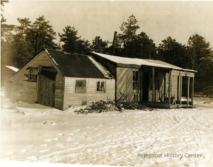 A B/W photograph of a house in Moodyville which has a canvas roof and a sink full of dishes "not washed for years." It also has an open pit toilet inside. Photo done as part of exposure of horrors of Moodyville says Merle Goff, former Town Manager. Undated