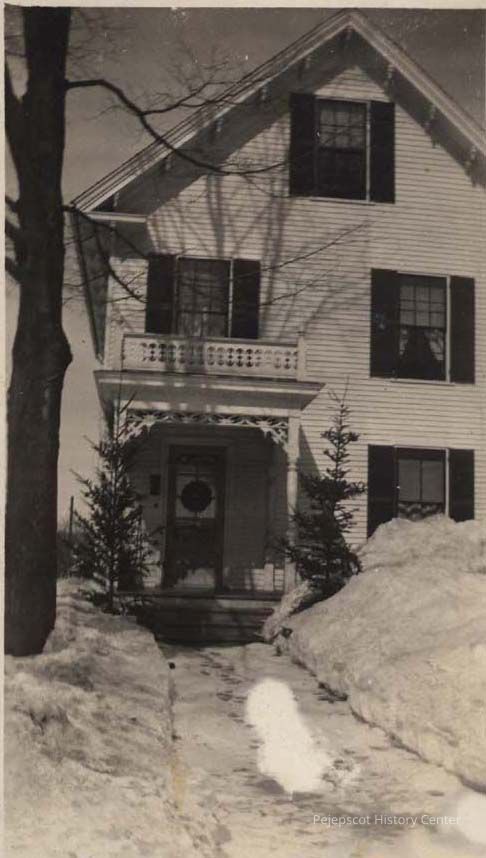 A B/W photograph of a house in the winter time. Marked on the back, "Front of House." Undated