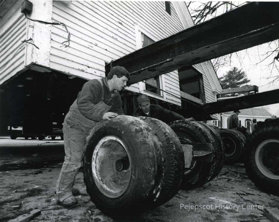 B/W photo of a house moving on Middle Street, Brunswick, ME. No date.