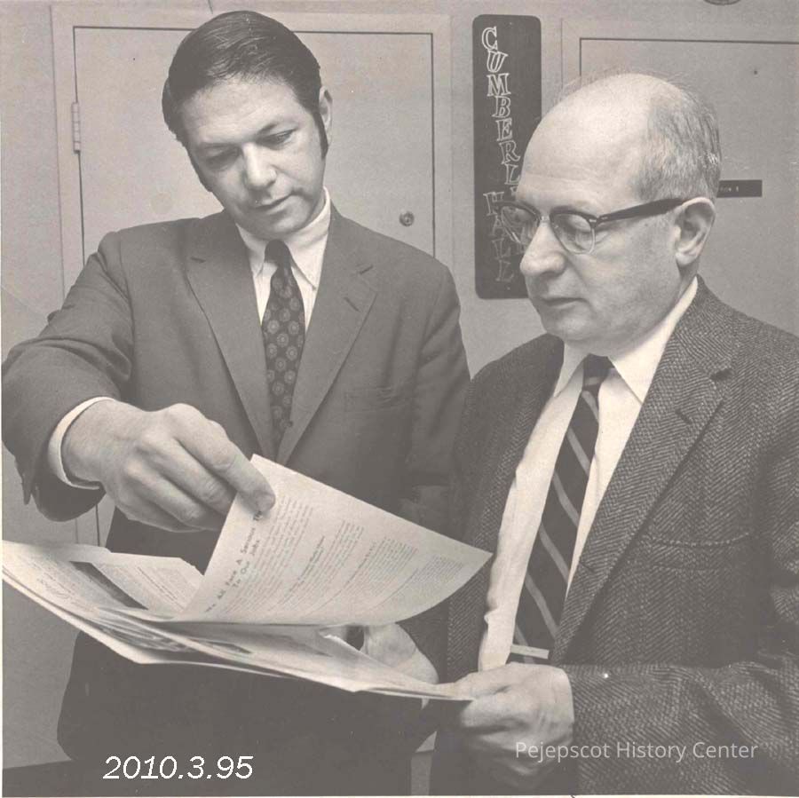 A B/W photograph of Howard D. Allen, Vice President of Auerbach Shoe Company and Edward F. Burrett, General Manager of the Maine Shoe Corporation. Undated