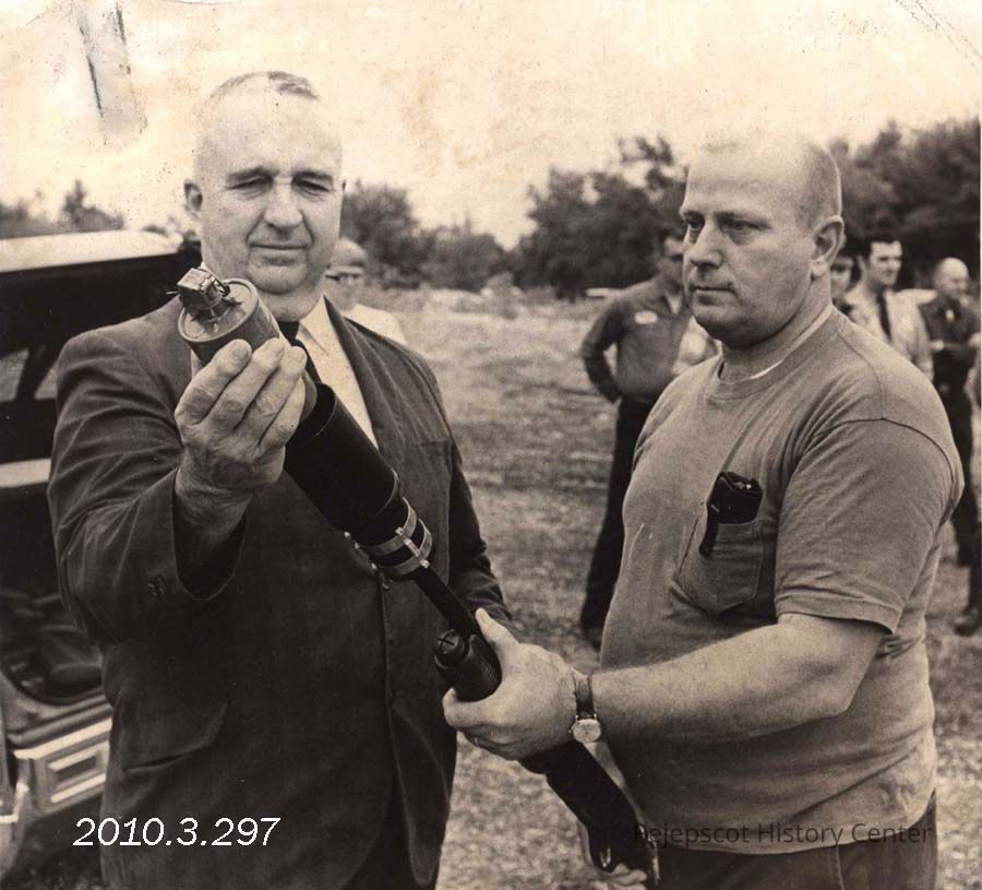 A B/W photograph of Howard Sarris (left) and Sgt. W. Earl McFarland (right) demonstrating the use of a gas-grenade launcher. Photo was published 9/10/1970. Undated