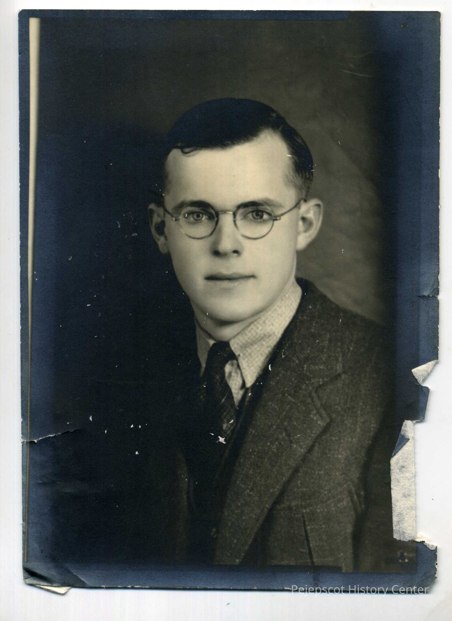 A black and white photograph of a man identified as Howard Sedgely, son of Pearl and Florence Sedgely (BHS Class of 1937).