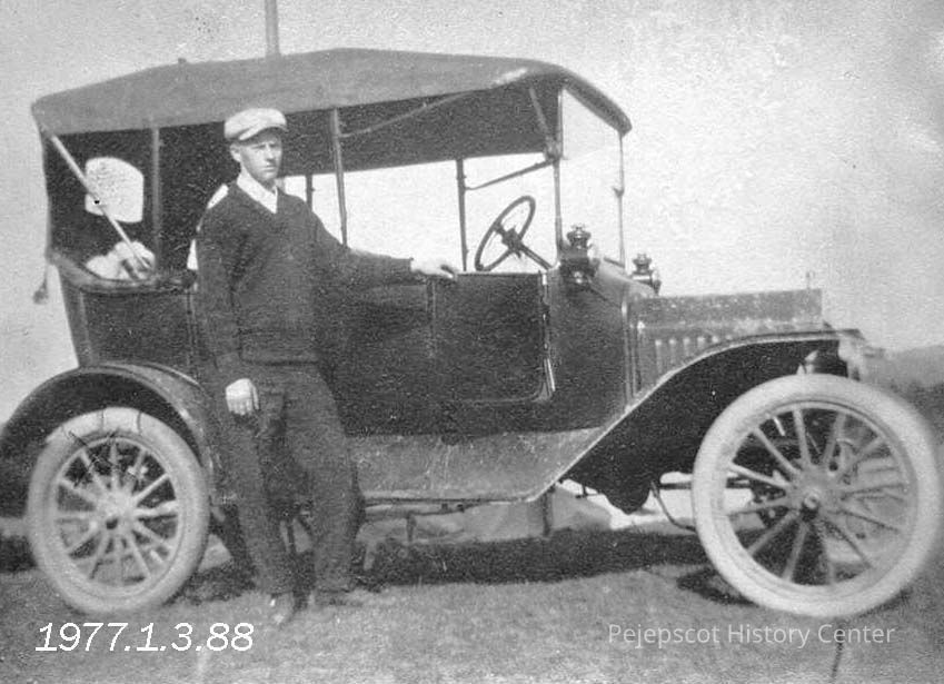 A B/W photograph of Howard Sylvester and his Ford. Undated