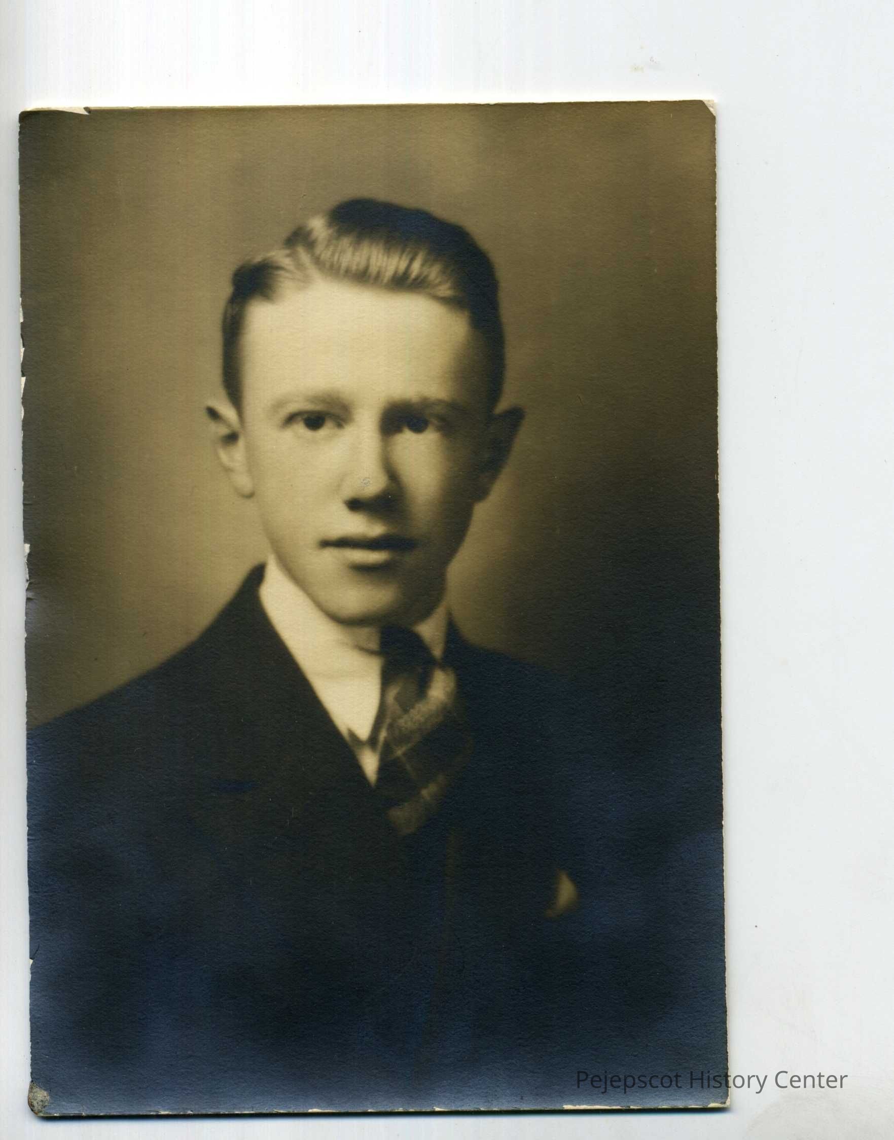 A black and white photograph of a man identified as Howard Walker, Jr. (BHS Class of 1937), son of Howard and Mildred Walker.
