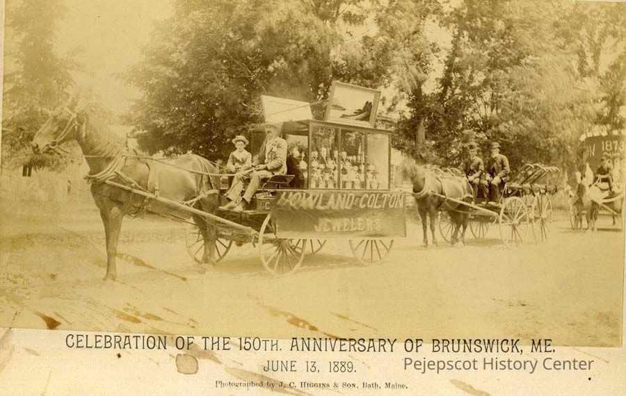 A sepia toned photograph of a float from the Brunswick 150 Anniversary Celebration. This float reads: "Howland & Colton, Jewelers." Above this is a glass display case holding lots of silver pieces and above this hangs a painting of a coastline with a road running along it. Behind this wagon is another wagon more simply decorated, possibly that of J.W. & O.R. Pennell (they are listed next in the Anniversary parade program--see Related). Behind this is a float with a huge circular contraption which reads in part: "1873 / 1889." Dated 06/13/1889.