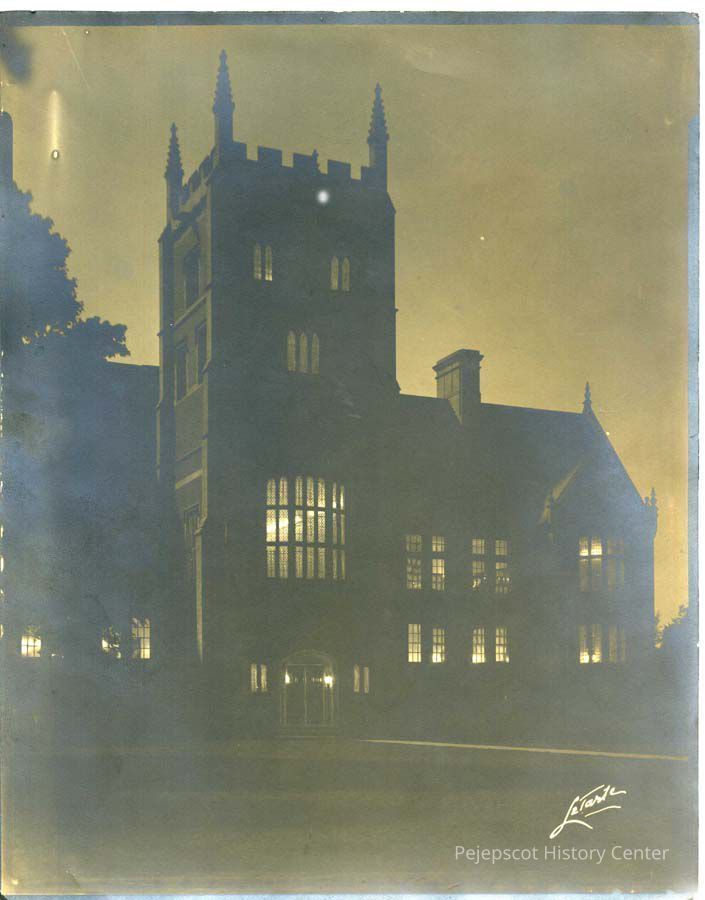 B/W photo of Hubbard Hall, Bowdoin College, at night.