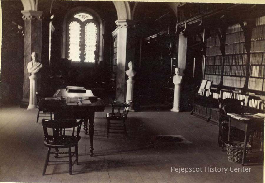 An undated black & white photo of the interior of Hubbard Hall on the Bowdoin College campus in Brunswick, Maine