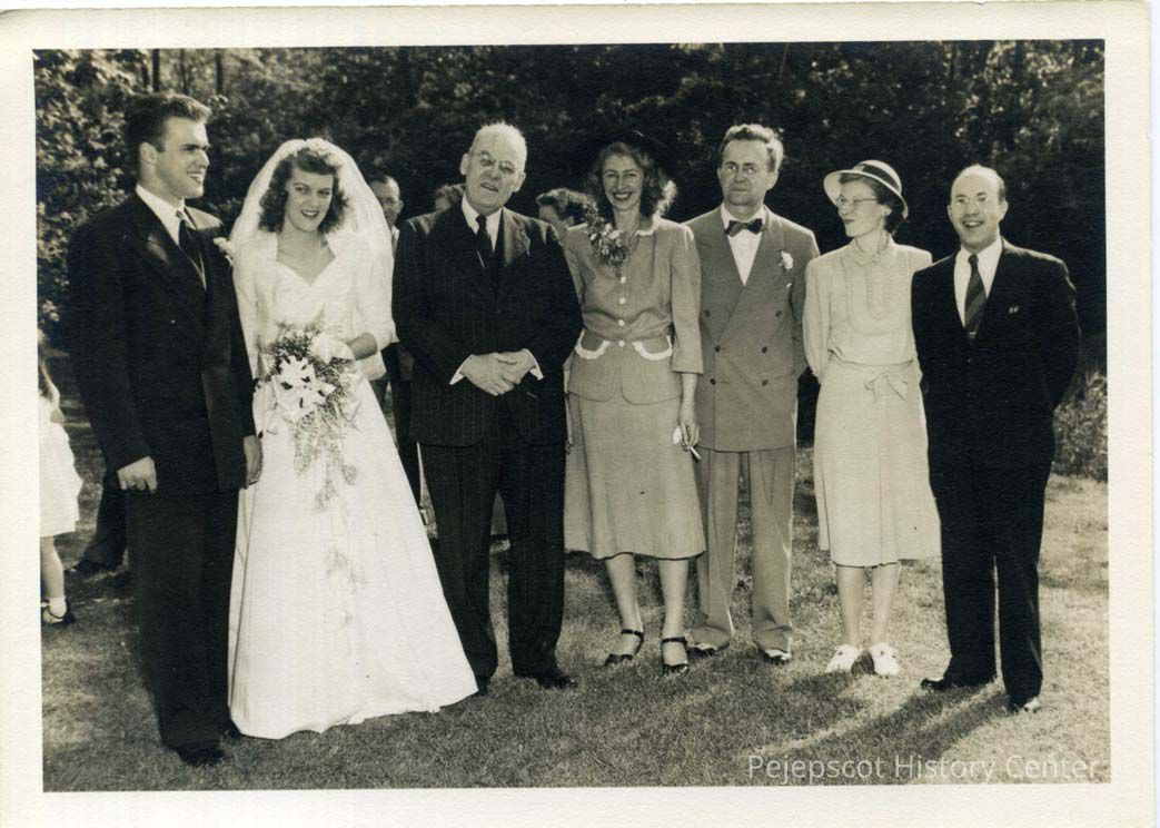 A picture of the groom and bride, Richard A, Huggins and Mary Little. To their right are Dr. Ashby, Mr and Mrs. Burt Whitman, Mary Sadler, and Orville Sadler. UndatedLexicon