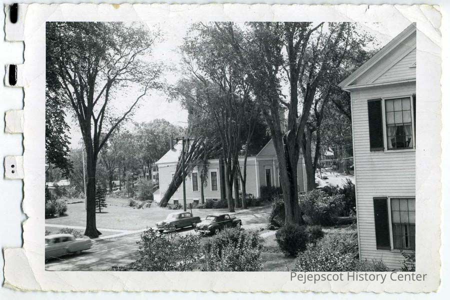 Black & white photograph of Topsham Town Hall, Elm & Green Streets, Topsham showing damage from the 1954 hurricane. This is a duplicate of 1982.1.20