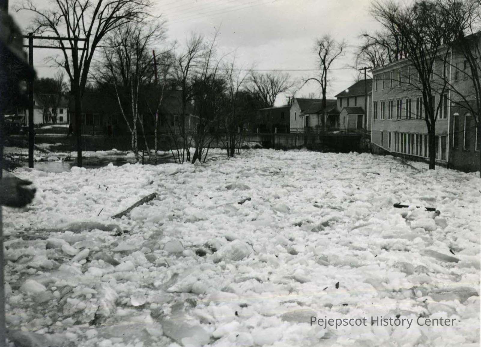 A B/W photograph of ice in the river near the Bowdoin Mill during the 1936 flood.