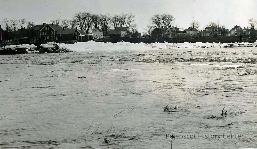 A B/W photograph of ice in the Androscoggin River and houses on the shoreline during the flood of 1936.