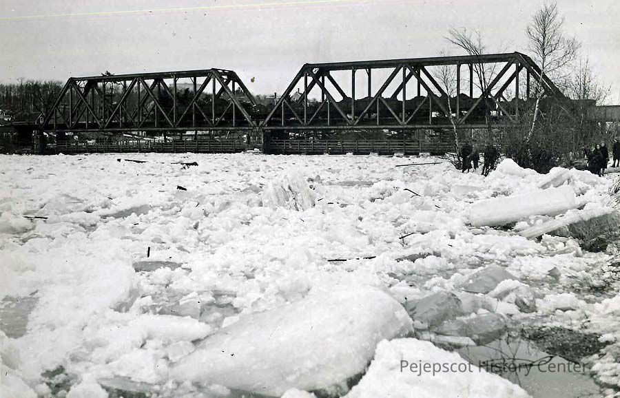 A B/W photograph of ice in the Androscoggin River above the Black Bridge during the 1936 flood