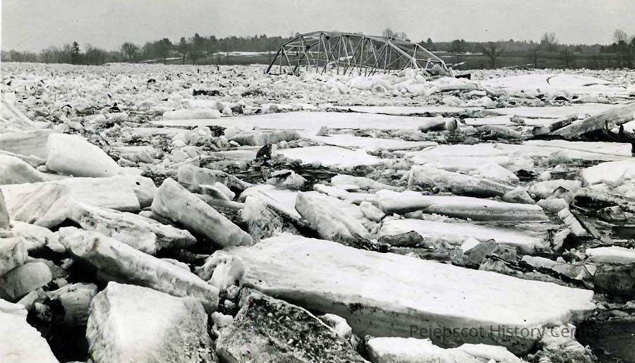 A B/W photograph of chunks of ice and a destroyed bridge in the Androscoggin River during the 1936 flood