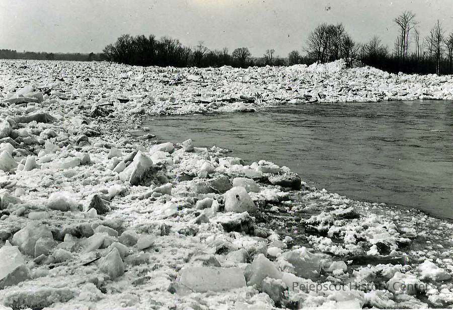 A B/W photograph of ice in the Androscoggin River during the 1936 flood.