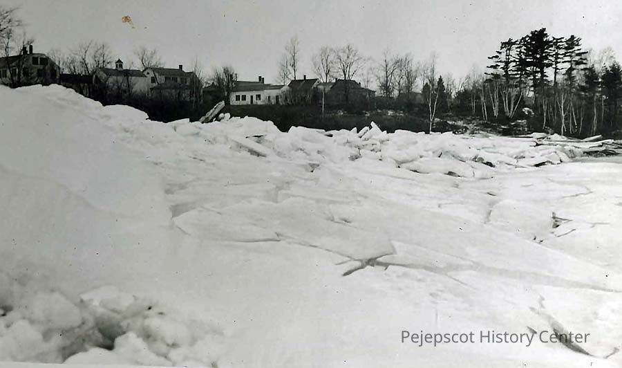 A B/W photograph of ice on the Androscoggin River during the 1936 flood.