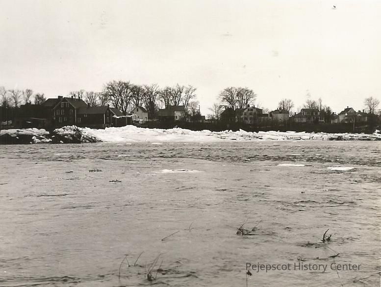 A B/W photograph of ice on the banks of the flooded Androscoggin River, Brunswick, ME. Undated, but speculated around the flood of 1936.Lexicon