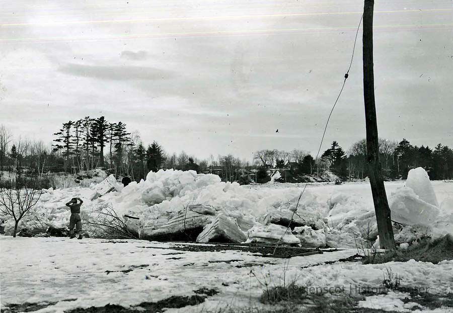 A B/W photograph of the ice on the Androscoggin River during the 1936 flood.