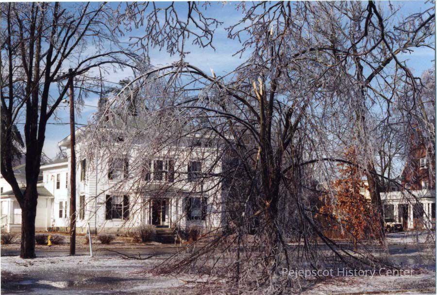 Color photograph of ice storm damage to trees on the Upper Mall, Brunswick ME. 1998.