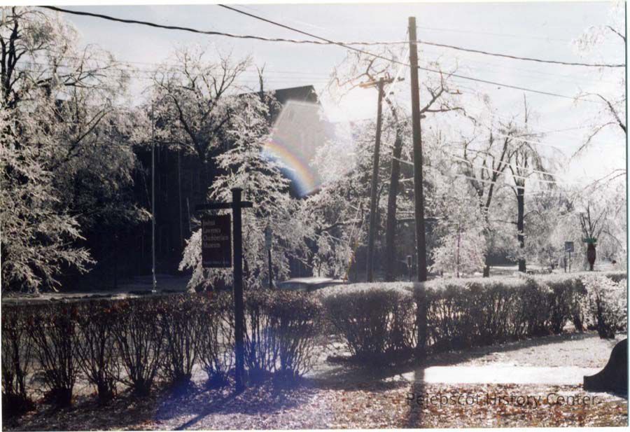 Photo Maine Street, Brunswick, ME including Joshua Lawrence Chamberlain House and the upper Mall, Ice Storm of 1998. 1998.