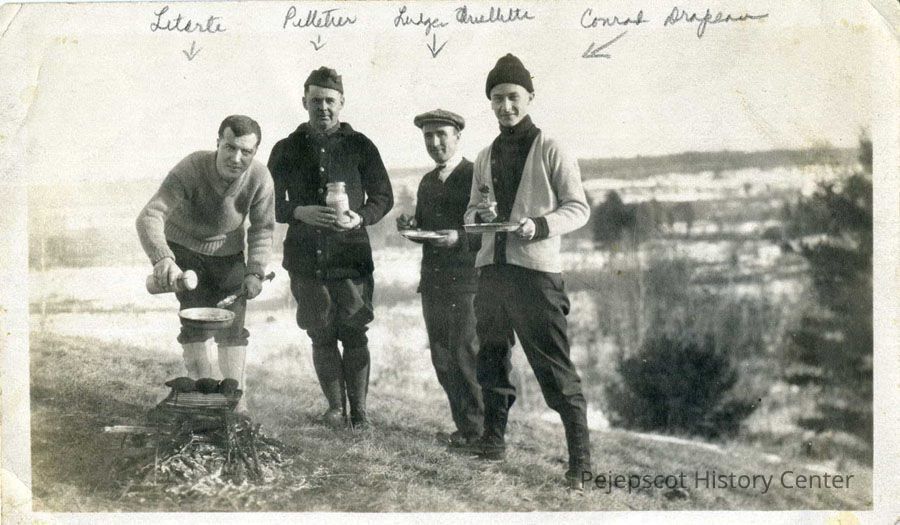 B/W photo of four men cooking over a campfire. The four men are identified as, L to R: Mr. LeTarte, Mr. Pelletier, Ludger Ouellette, and Conrad Drapeau.