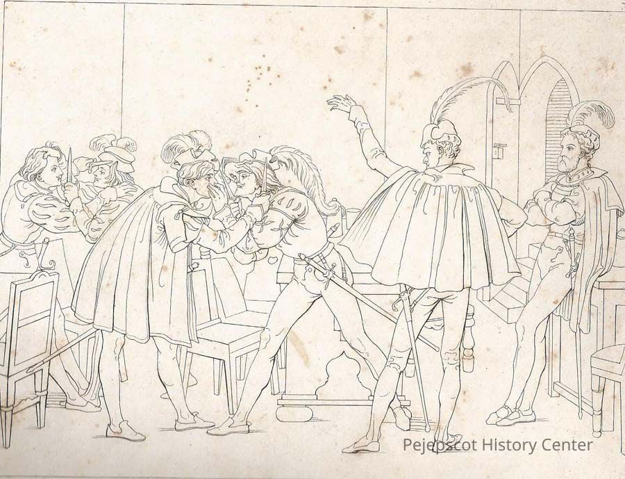 A B/W engraving of two pairs of men fighting with knives, while two other men look on. Illustration seems to depict a Renaissance-era story.
