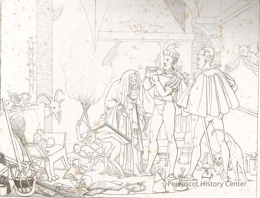 A B/W engraving of two men shopping. Illustration seems to depict a Renaissance-era story. The illustration includes several animals, including monkeys, cats and a goat. An elderly woman, perhaps a witch, looks on. There are several indications of witchcraft, including snakes, bats, skulls and devils. The illustrations seems to show the purchase of a spell or potion.Lexicon