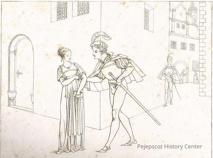 A B/W engraving of a man and a woman walking on a street. Illustration seems to depict a Renaissance-era story.