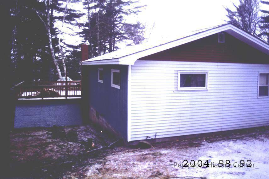 A color photograph of the camp at 2684 Indian Rest Road, Harpswell, Maine showing the back deck..