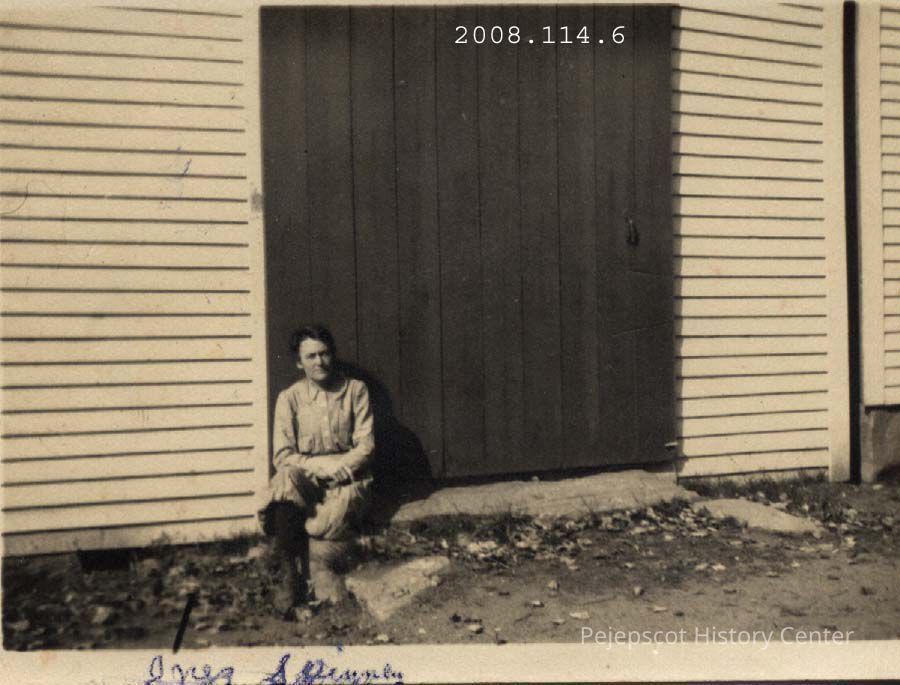 A B/W photograph of Inez Spinney. She is sitting in front of her barn door. A dog is sitting in front of her. Undated
