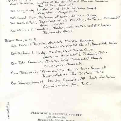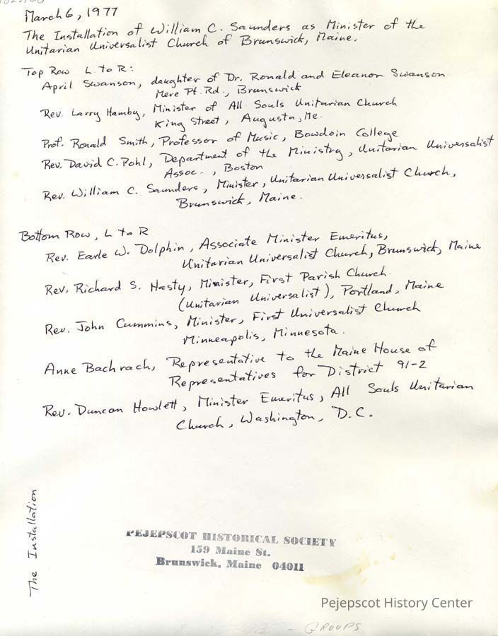 A black and white photo from the installation of William C. Saunders as the minister of the Unitarian Universalist Church in Brunswick dated March 6, 1977. The individuals are identified on the back as follows: