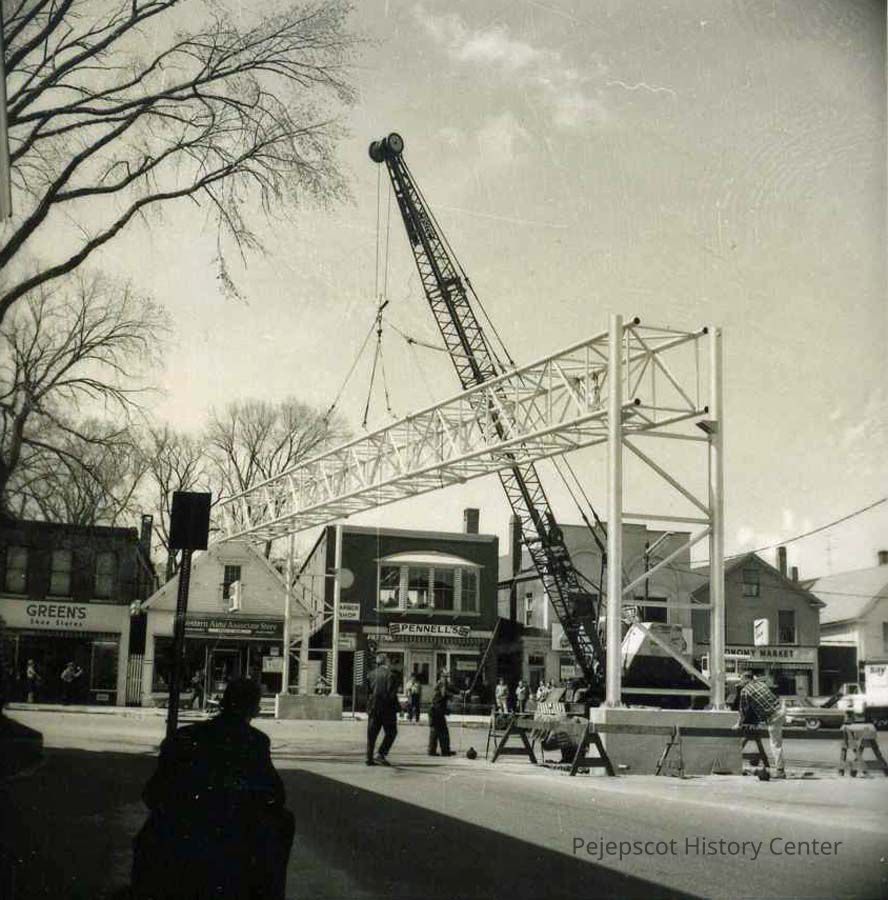 A B/W photo of crews installing traffic signs at the corner of Maine and Mason Streets.