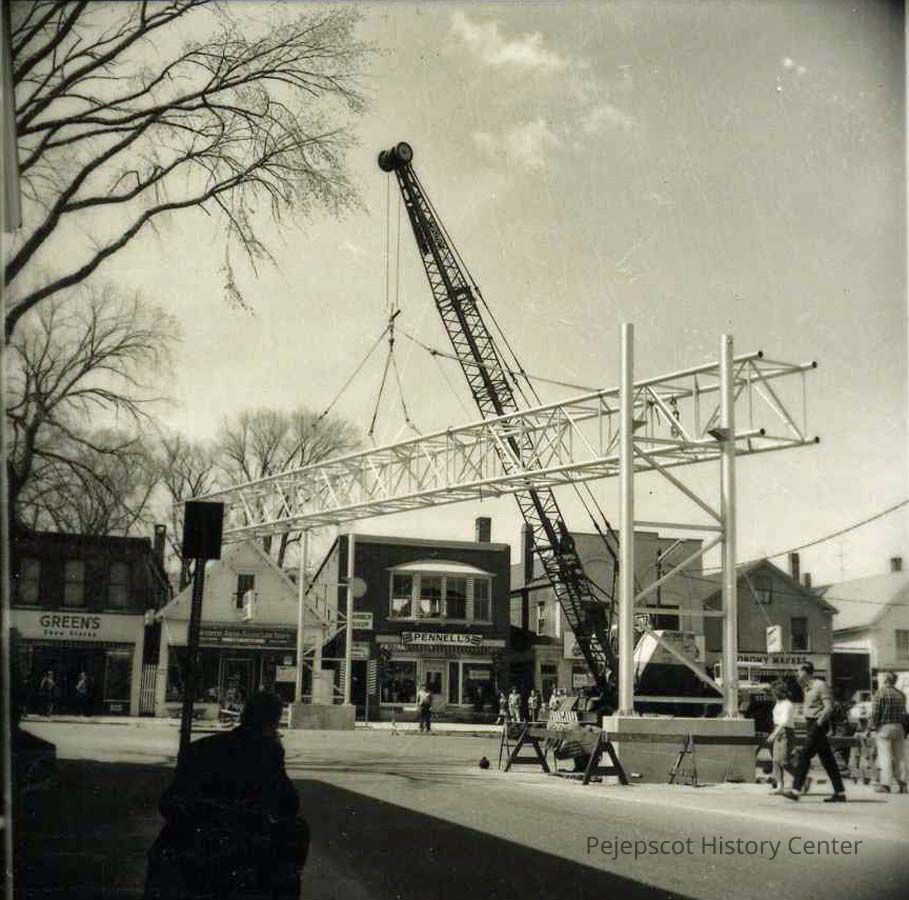A B/W photo of crews installing traffic signs at the corner of Maine and Mason Streets.