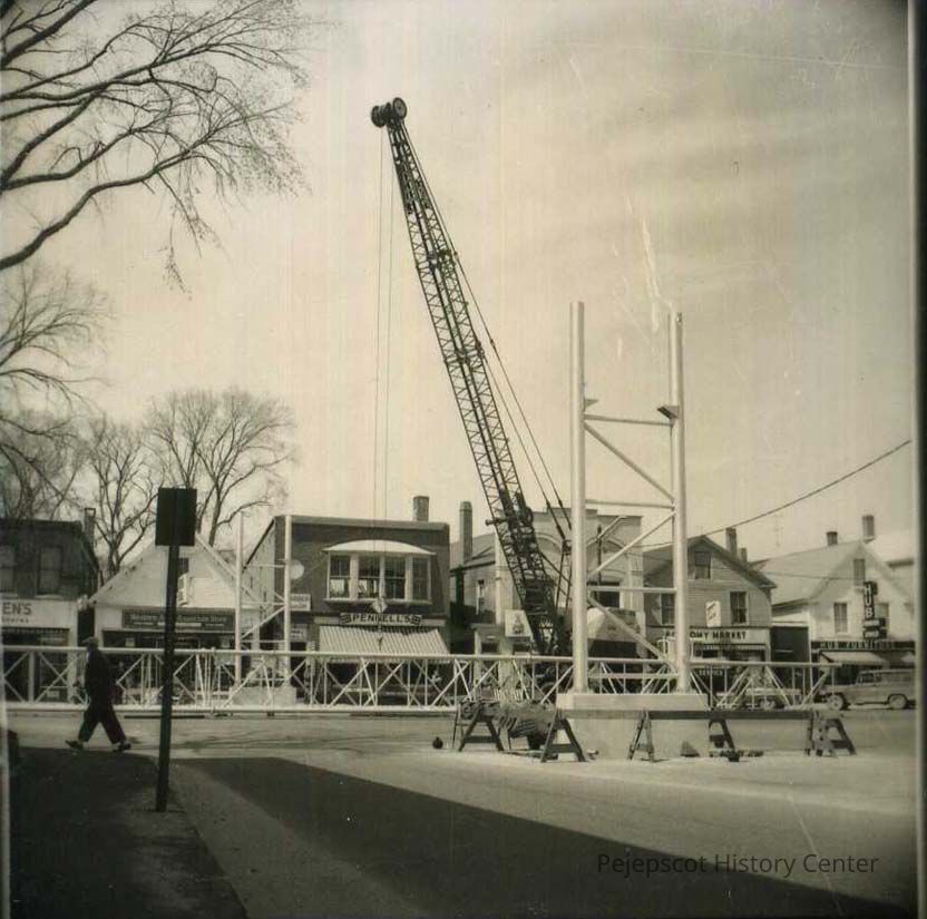 B/W photo of crews installing traffic signs at the corner of Maine and Mason Streets, Brunswick, ME. No date.
