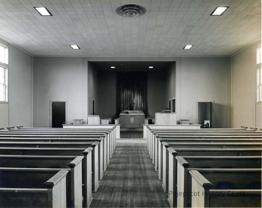 A B/W photograph of the interior of Brunswick Naval Air Station Chapel. Undated
