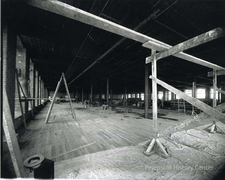 An undated black and white photograph of the interior of Cabot Mill under renovation/construction.