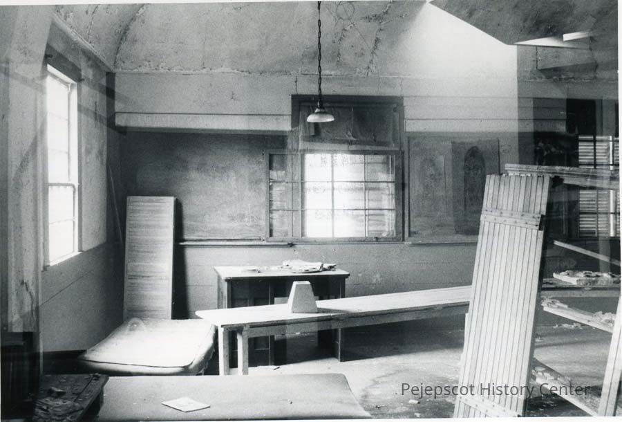 A black and white photograph of the interior of Growstown School in Brunswick, ME before its restoration. Dated 1973.