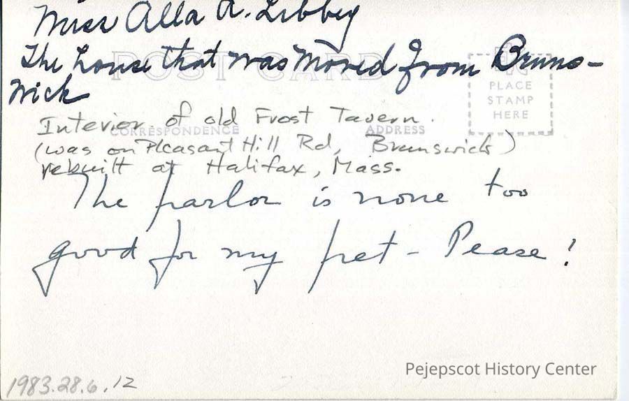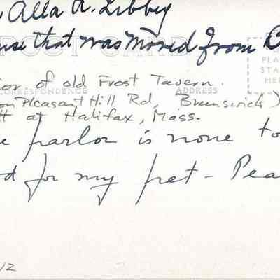 The home was moved from Pleasant Hill Road, Brunswick (possibly referred to as the Old Portland Road in early documents) in 1940. Miss Alla A. Libbey purchased the home in Brunswick and had it dismantled board by board and shipped via rail to Halifax, MA. The house is currently located at 204 Plymouth Rd, Halifax, MA.Collection