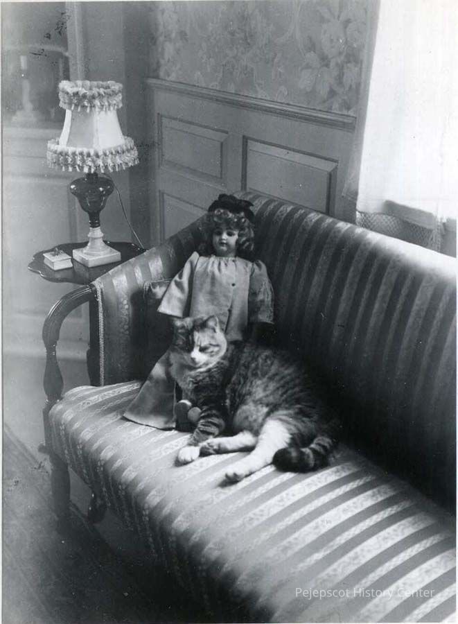 B/W picture postcard of the interior of the Noah Melcher Inn/Tavern (also known as the Old Frost Home and Half-Way Tavern) at its current location in Halifax, Massachusetts. The postcard is unused and depicts a couch with a doll and cat on it.