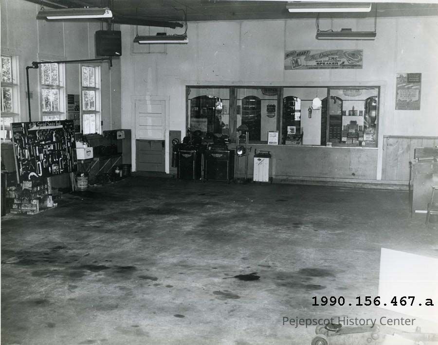 A B/W photograph of the interior of Ouellette Motors showing the parts area. The garage was on Elm and Middle Street and is now (1990) called Brunswick Transportation. Undated