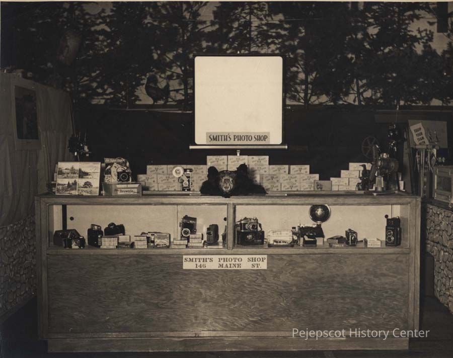 A B/W photograph of the interior of Smith's Photo Shop on Maine Street in Brunswick. Undated