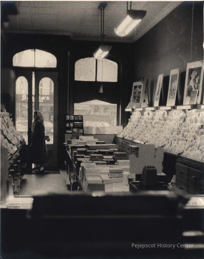A B/W photograph of the interior of Smith's Photo Shop at 146 Maine Street. Undated
