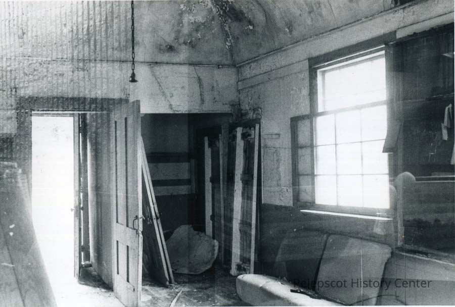 A black and white photograph of the interior of the Growstown School in Brunswick, ME before its restoration. Dated 1973.