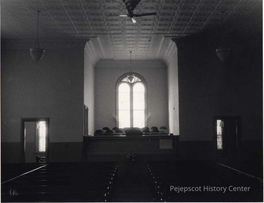 A B/W photograph of the interior of the United Methodist Church on Pleasant Street. Undated