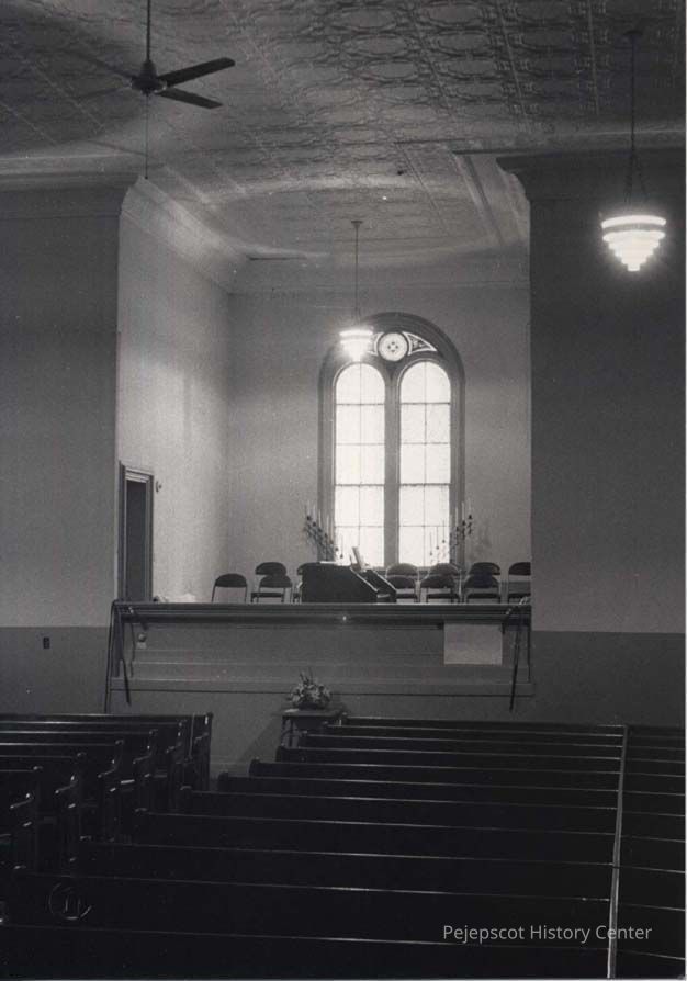 A B/W photograph of the interior of the United Methodist Church on Pleasant Street. Undated