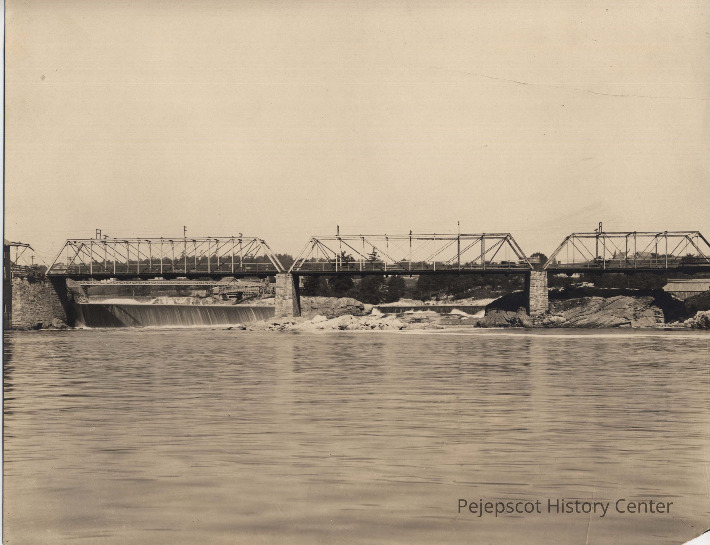 B/W photo of the "Iron Bridge" looking upstream from Brunswick side. Undated