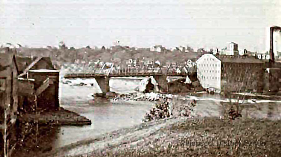 A B/W photo looking upstream of the Androscoggin River. The Bowdoin Mill and the old Iron Bridge can be seen. Brunswick and Topsham. Undated