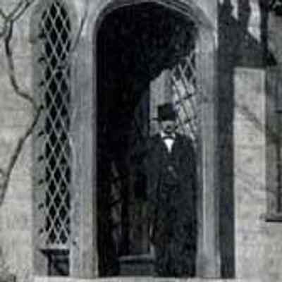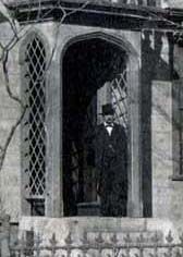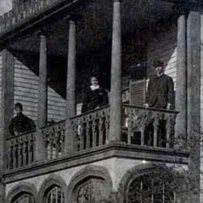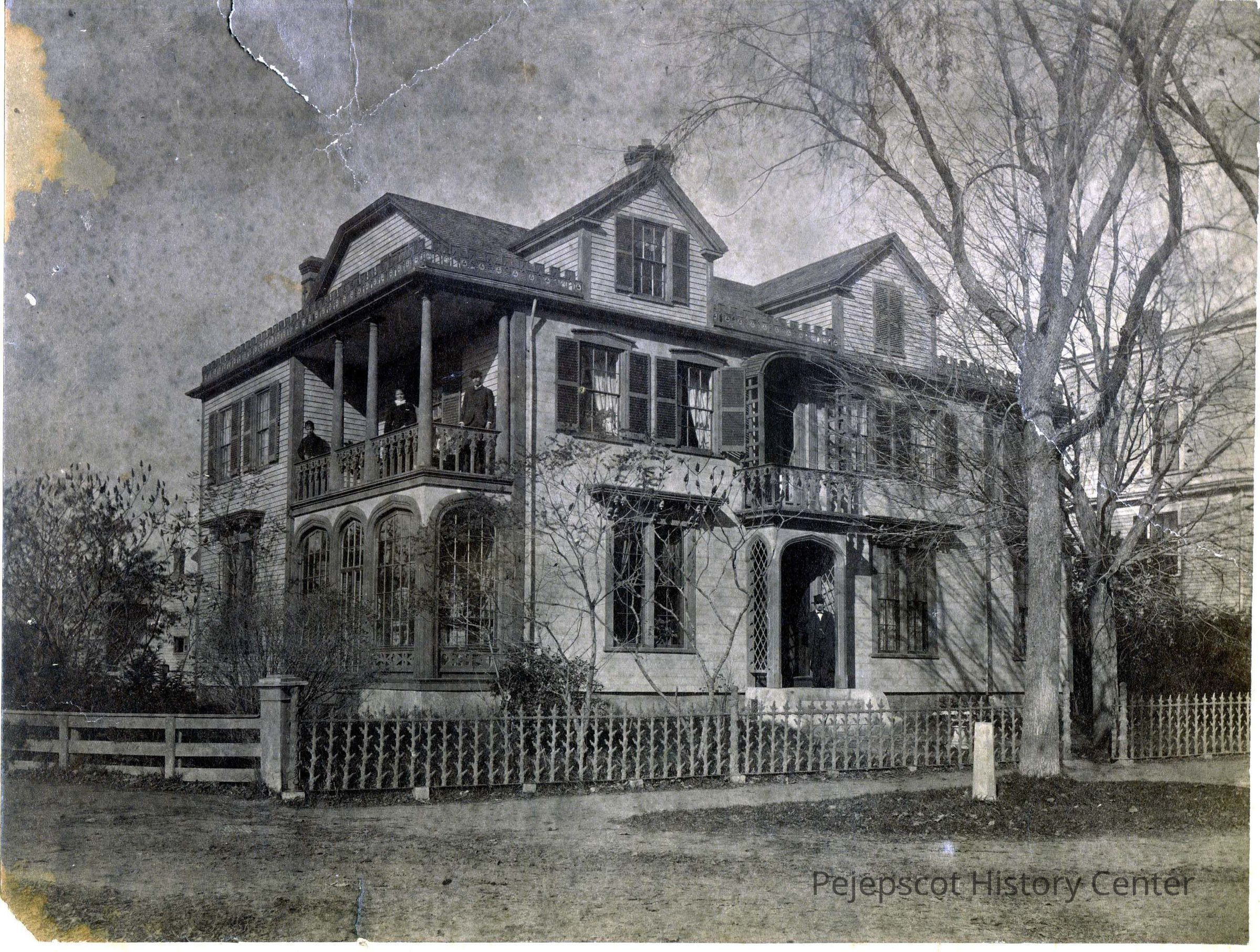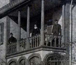 A B/W photograph of the J.L. Chamberlain House with a person standing in front and three people on the second floor porch.