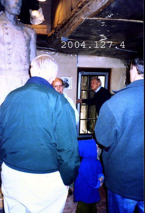 J. Query showing his clay model of the JL Chamberlain statue to some people.
