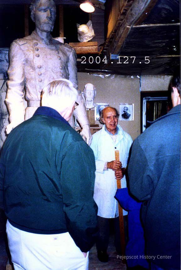 A color photograph of 2 men talking to J. Query. The clay model of the J.L. Chamberlain statue is in the background.