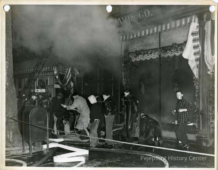 A black & white photograph of a fire at the J.E. Davis Co. in the Lincoln Building on Maine St., Brunswick, ME. Storefront view with people and firemen present.